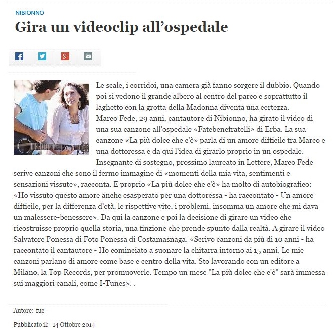 Sono Marco Fede, siciliano residente a Lecco, scrivo, canto, suono da più di dieci anni, da quando mio fratello mi regalò una chitarra, da lì iniziai a suonare, scrivendo canzoni per le ragazze, per la vita, per tutte le cose che mi capitavano ogni giorno. A scuola le cose non andavano molto bene, tra litigi con compagni e incomprensioni con gli insegnanti, per non parlare del malessere adolescenziale che mi soffocava quotidianamente. Poi arrivò la musica con le sue speranze, con le sue esperienze belle e brutte, con le illusioni, con gli incontri che ti promettono l’America, con tutti quei discorsi che non hanno nulla a che fare con la musica. Il videoclip della mia ultima canzone “La più dolce che c’è” rappresenta il cambiamento, la voglia di svoltare per ritrovarsi in un’autostrada con panorami mozzofiato, la voglia di fare dei miei desideri e sogni pura realtà, la necessità di dire la mia sotto forma di canzone, il desiderio di uscire dal guscio che mi ero costruito per non guardare il mondo in faccia. Il tema dell’amore e delle donne spesso ricorrente nelle mie canzoni rappresenta non tanto un amore nei confronti di certi temi, ma semplicemente il bisogno estremo di raccontare quello che mi è successo nel campo sentimentale sino ad oggi, il bisogno, la necessità di scrivere canzoni che parlano di amori strani, speciali e a volte impossibili che penetrano nel centro dell’anima. Canzoni scritte nelle sere d’estate tra una stella cadente e un falò, scritte ovunque, su quaderni, diari, fogli volanti, banchi di scuola e addirittura una volta su un scatola di scarpe. Ho incontrato alcune difficoltà nella mia vita che però mi hanno reso più forte e la musica è stata in grado di darmi quella forza che avevo quasi perso e la musica è stata la spinta per mollare. Fino ad un anno fa pesavo quasi 90 kg e vedermi gonfio e con il pancione di un vecchio alcolizzato mi faceva sentire sempre più alienato. Ho passato anni a cercare la pillola giusta per questo mal di vivere, ma l’unica medicina in grado di curarmi è stata la scrittura, la musica e la parola, strumento fantastico in grado di connetterti alla realtà e condurti sul cammino della forza e della speranza. Adesso si tratta solo di continuare a lavorare sempre di piu' su questo mio progetto artistico che coltivo da anni. La forza c’è, l’energià c’è e la fantasia non manca...soprattutto non bisogna perdere mai il carattere divertente della musica, affinchè questa fantastica forma di espressione rimanga prima di tutto un piacere e una passione da far crescere giorno per giorno